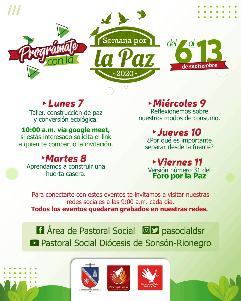 Este año, la Pastoral Social y la Corporación Vida Justicia y Paz liderarán la semana por la paz del 6 al 11 de septiembre, con eventos totalmente virtuales, que tienen como objetivo generar en la región elementos de reflexión llevando a un compromiso personal y colectivo entorno a la construcción de paz y el cuidado de la casa común; haciendo eco del mensaje que el Papa Francisco nos ha hecho desde la Encíclica Laudato Sí´.